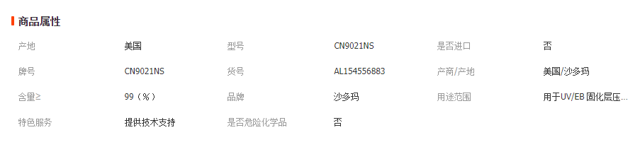 CN9021 NS丙烯酸酯產(chǎn)品描述CN9021 NS 用于UV/EB 固化層壓膠及壓敏膠配方??商峁┝己玫母街?,柔韌性及耐水性,特別對于玻璃材料。產(chǎn)品特征對玻璃附著力高伸長率耐濕產(chǎn)品性質(zhì)良好的附著力良好的耐水性高伸長率柔韌性好建議應(yīng)用層壓材料壓敏膠CN9021 NS 典型物理和化學(xué)性質(zhì)外觀清澈液體顏色,APHA100粘度,厘泊 @60℃